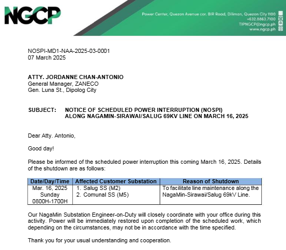Notice of NGCP Scheduled Power Interruption – March 16, 2025