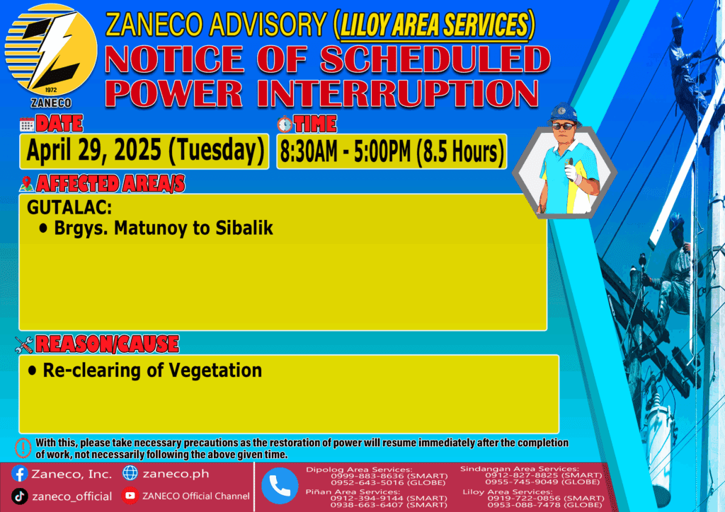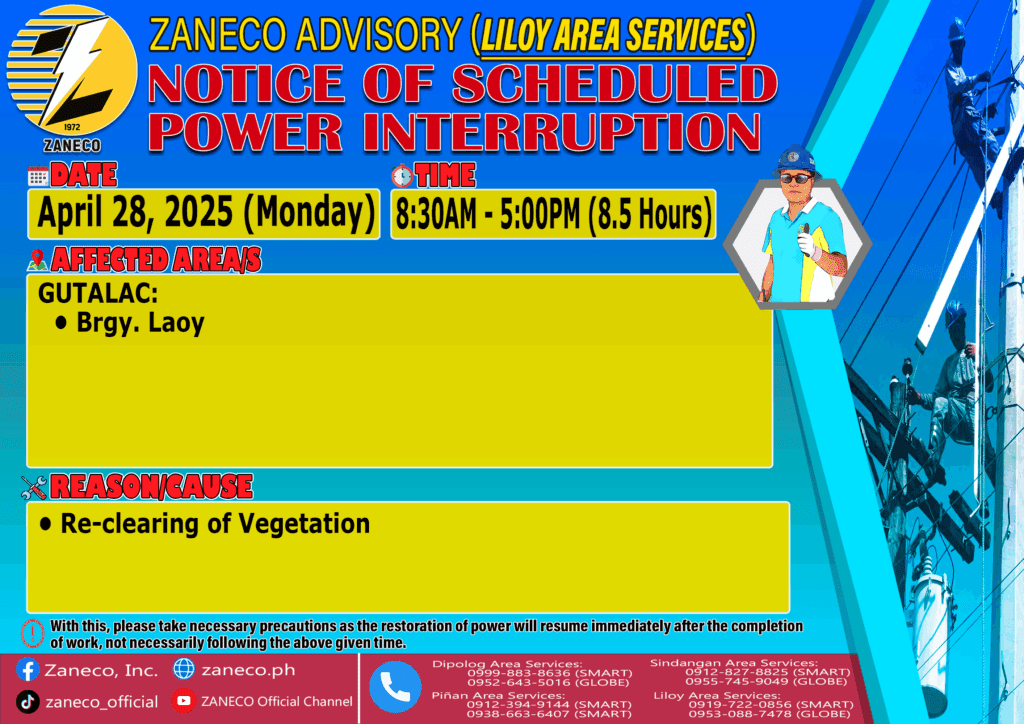 Notice of Scheduled Power Interruption LAS – April 24, 25, 26, 28, 29 & 30, 2025