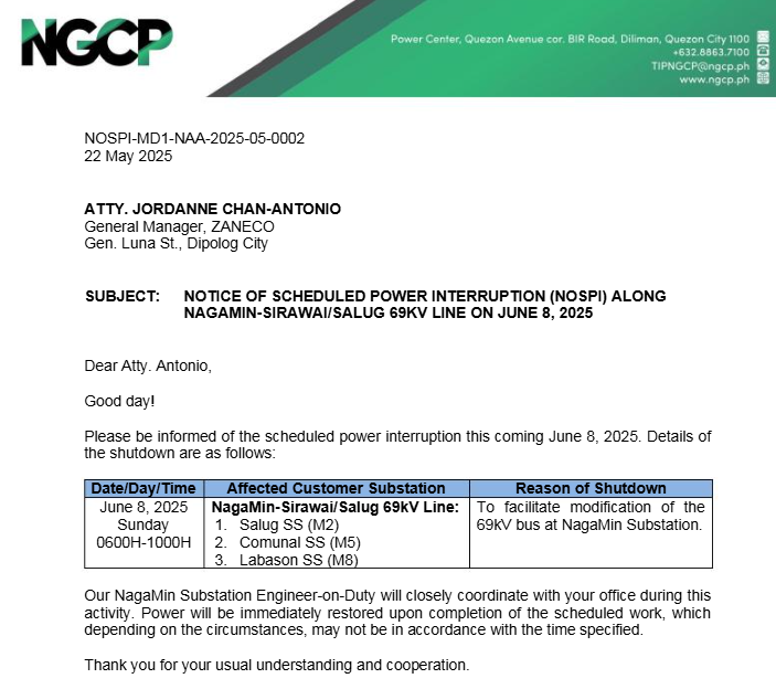Notice of NGCP Scheduled Power Interruption – June 8, 2025